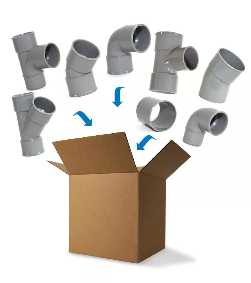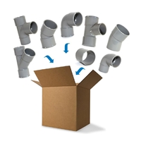 Colis de raccords PVC diamètre 40mm, évacuation. Composition: 30x Coude MF 45° DN40 20x Coude FF 45° DN40 20x Coude MF 87°30 DN40 30x Coude FF 87°30 DN40 10x Réduction incorporée 40 x 32 10x Culotte FF 87°30 DN40 10x Manchon à butée DN40